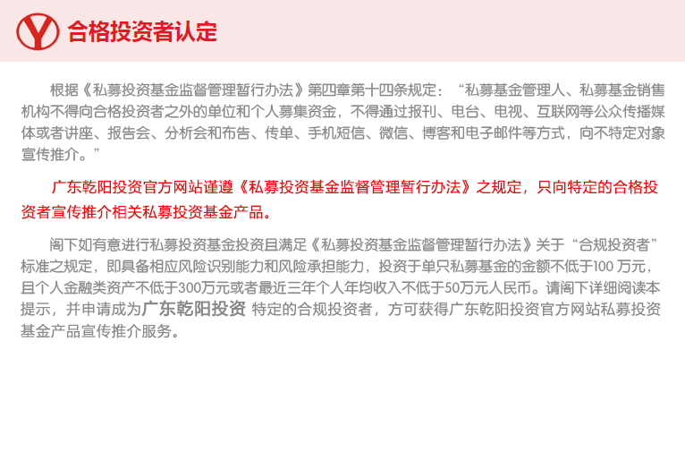 廣東乾陽(yáng)投資管理有限公司于2011年5月在廣州成立,注冊(cè)資本1000萬(wàn)元,是一家在中國(guó)證券投資基金業(yè)協(xié)會(huì)登記備案的私募投資基金。 公司秉持“客戶利益,審慎經(jīng)營(yíng),規(guī)范誠(chéng)信,志在久遠(yuǎn)”的經(jīng)營(yíng)理念,踐行“公司的內(nèi)在價(jià)值決定其投資價(jià)值”的核心投資理念,悉心打造公司的核心競(jìng)爭(zhēng)力——深入嚴(yán)謹(jǐn)?shù)耐堆蟹治瞿芰Γ∈亻L(zhǎng)期、集中的投資策略并結(jié)合基于估值及市場(chǎng)趨勢(shì)的選時(shí)策略,形成了乾陽(yáng)投資成熟穩(wěn)健的投資風(fēng)格。 公司以產(chǎn)業(yè)資本的視角深度挖掘資本市場(chǎng)中的優(yōu)秀企業(yè),通過(guò)建立嚴(yán)謹(jǐn)?shù)纳鲜泄菊{(diào)研制度,嚴(yán)肅的投資決策流程和嚴(yán)格的風(fēng)險(xiǎn)管控制度,力圖實(shí)現(xiàn)高回報(bào)與確定性的完美統(tǒng)一,幫助客戶分享企業(yè)持續(xù)穩(wěn)健成長(zhǎng)帶來(lái)的... |